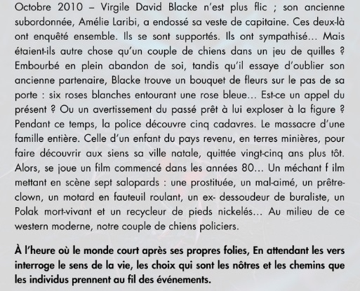 (Pour « En attendant les vers ») : Un polar endiablé, foisonnant d’originalité, extrêmement bien mené, duquel se dégagent beaucoup de mélancolie et une certaine noirceur.